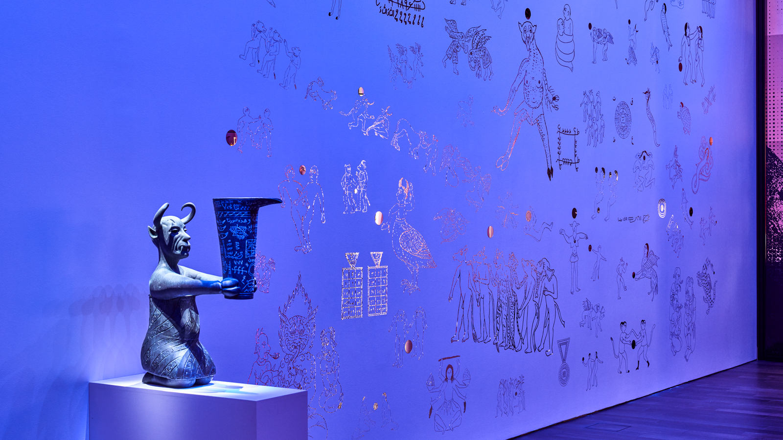 Top image: installation view of Allahyari’s The Queer Withdrawings and Qareen I and Qareen II (“constant companions”), in the exhibition Rave Into the Future: Art In Motion.