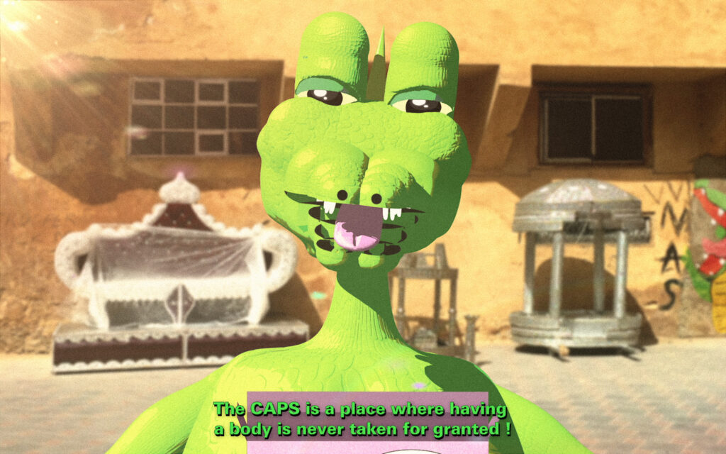 This speculative energy, rooted in movement as resistance and futurity, continues in the work of Meriem Bennani (fig. 4). Her vision of the future honors communal resilience, humor, and the refusal to be confined by essentialist ideas of identity and culture. Her video Party on the CAPS follows Fiona, a chatty crocodile, through a futuristic island refugee camp where teleportation has replaced air travel. The story unfolds at a birthday party in the Moroccan quarter of the CAPS filled with drumming, dancing, and a rapping MC, offering a surreal but tender portrait of cultural continuity.