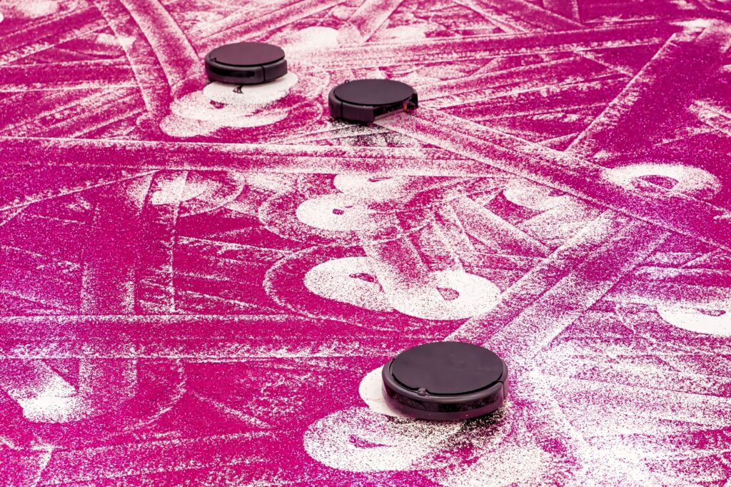 The exhibition begins and ends with the chaos of an after-party. In Puff Out M_2205_pink, :mentalKLINIK unleashes a fleet of robotic vacuum cleaners to roam a glitter-covered platform, drawing in and redistributing the glitter as they go (fig. 7). Elsewhere, the duo’s architectural and linguistic interventions scattered throughout the galleries push the boundaries of institutional space, extending the spirit of the rave: immersive and playfully unruly. During many internal discussions in the museum about the potential harm of glitter, one question lingered on my mind: Why are we so afraid of glitter? It is excessive and hard to contain, and it mirrors the very conditions of joy and collectivity that institutions often struggle to hold. Its refusal to stay still, like the rave, is what makes it so powerful.